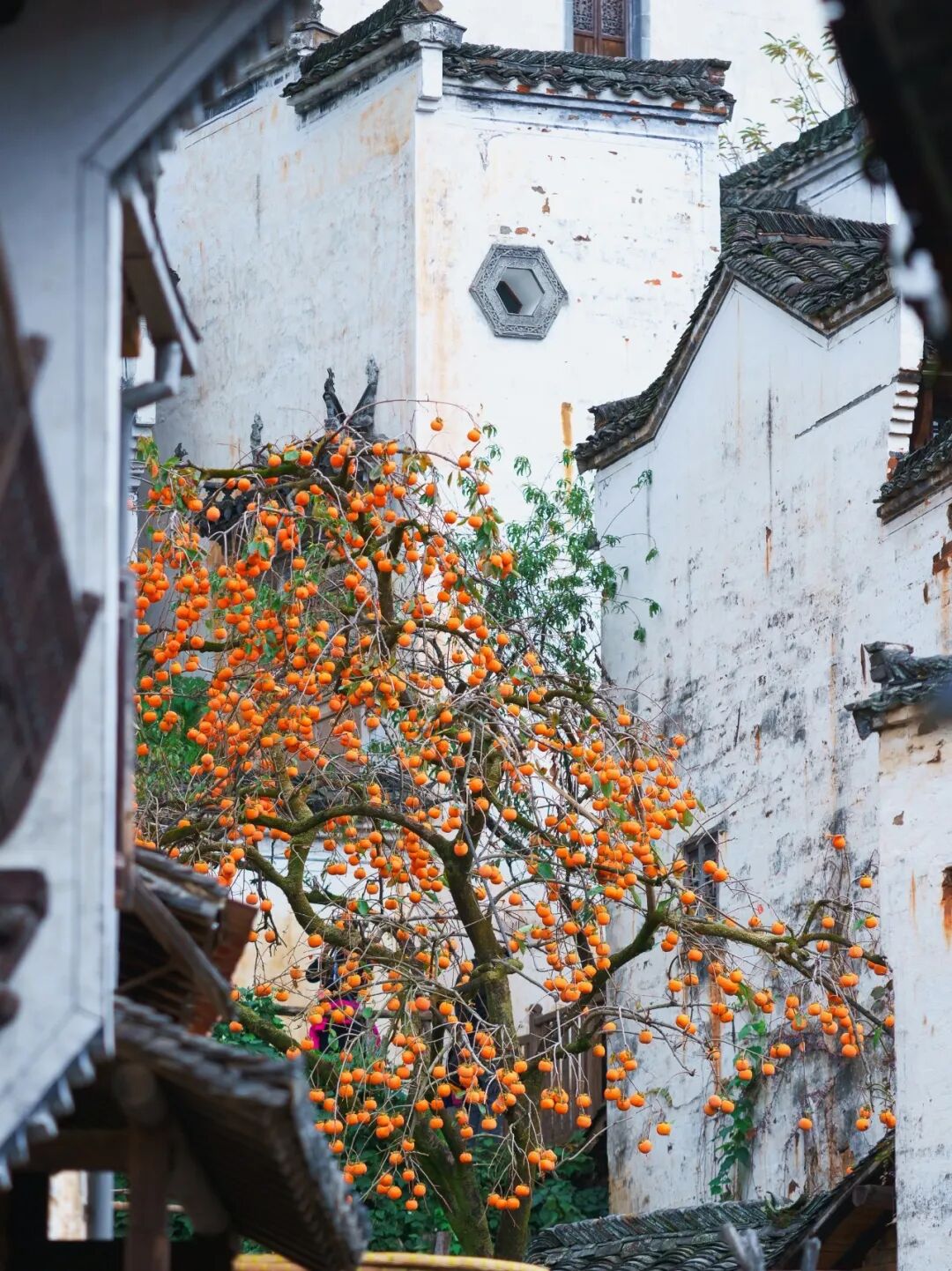 入秋后的篁岭,除了晒盘里的五彩斑斓,更有枝头间的喜悦。村内棵棵柿子树上,黄澄澄的柿子像一盏盏小灯笼挂满枝头。它们与徽派建筑特有的飞檐翘角相互映衬,为古老的村落增添了几分灵动的生命力。随手拍下一张照片,都是一幅充满韵味的风景画。