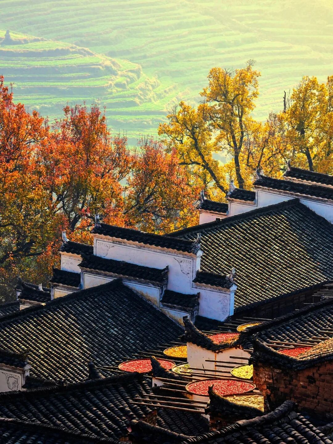 火红的辣椒、金黄的玉米、橙黄的南瓜……各种丰收的果实,仿佛大自然被打翻的调色盘,错落有致地点缀在粉墙黛瓦的徽派建筑之间。这不仅是村民们顺应天时、储存食物的智慧,也成了一幅流淌的、壮丽的田园诗画。
