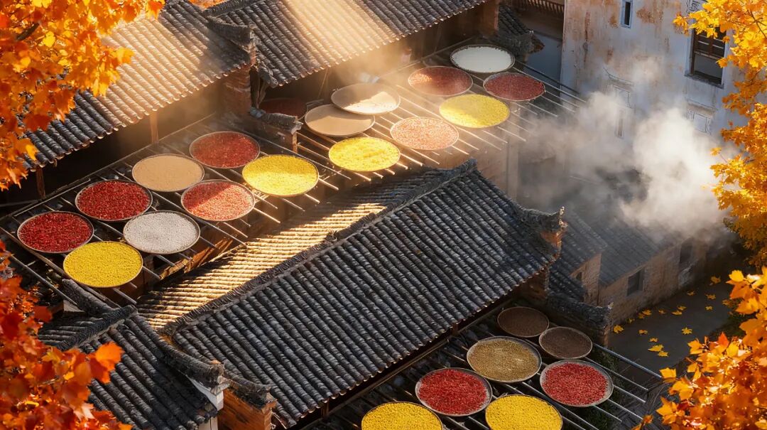 “四时俱可喜,最好新秋时”,篁岭的秋天从不会让人失望。一进古村,最先撞进眼里的就是晒秋——晒匾把崖上古村铺成了调色盘,辣椒的红,皇菊的黄,一层层搭在屋顶、挂在晒架上,风一吹,连空气里都裹着粮食的甜香