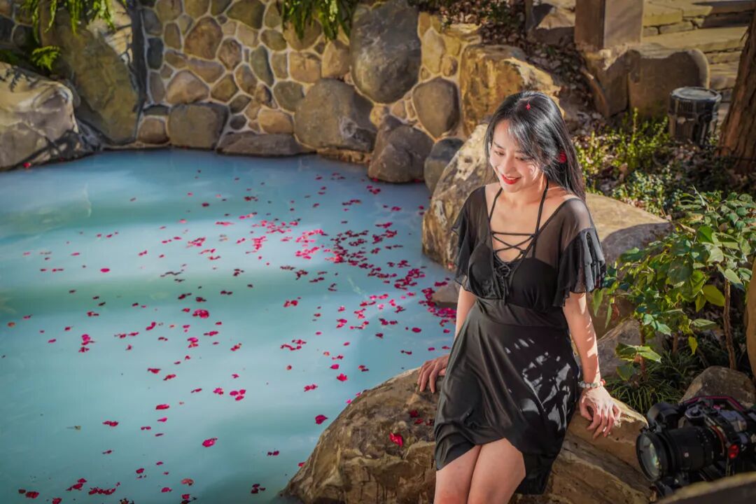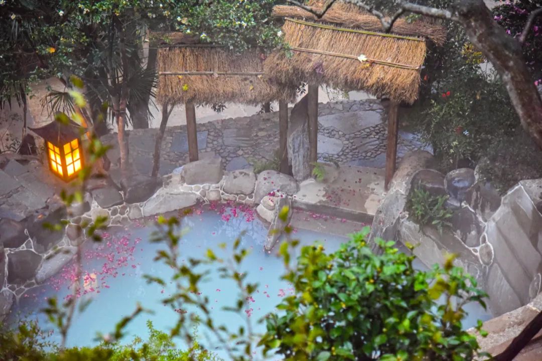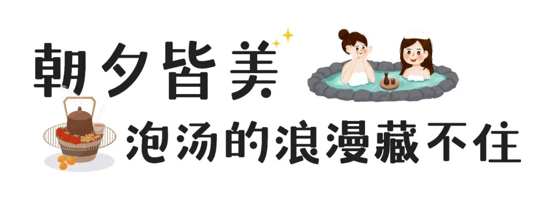 最让人安心的是,汤池24小时都在循环过滤,每天还会补新水、做消毒,换一身松软的浴衣坐进去,不用有半点顾虑。温热的水慢慢漫过膝盖、腰腹,刚才逛古村、踩落叶时攒下的倦意,像被温水悄悄揉化了。