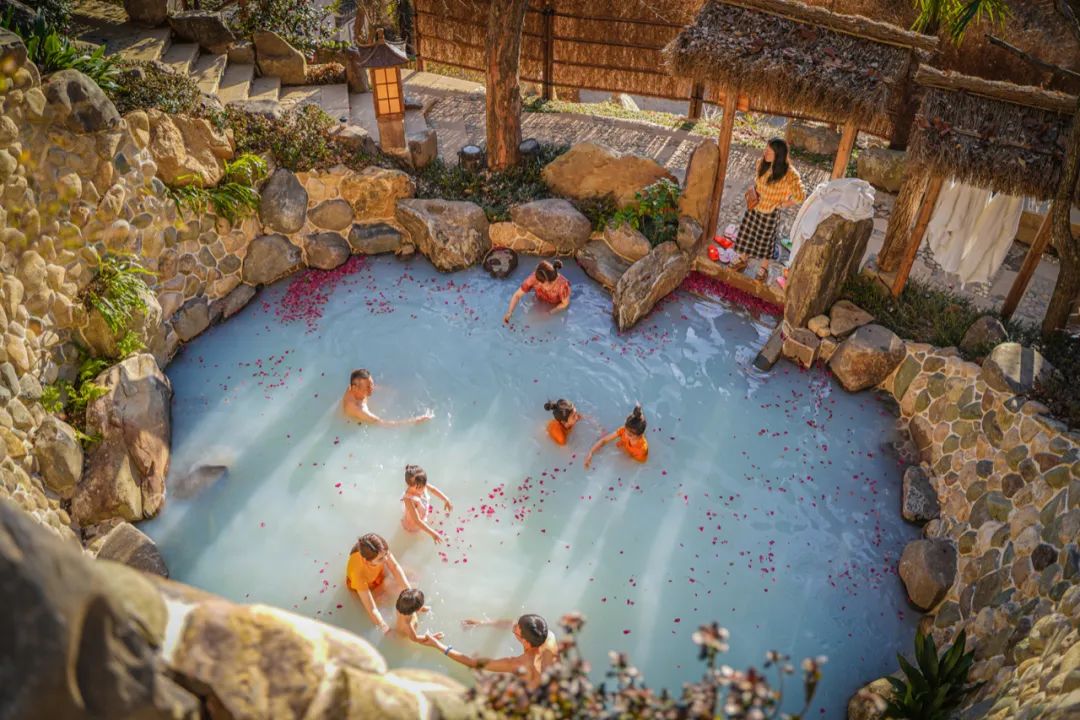这里的八个户外汤池各有讲究,爱美的选红酒汤、牛奶汤,泡完皮肤都透着润;想舒舒服服松口气,就试试艾草汤、硫磺汤,暖意顺着毛孔往骨子里钻。