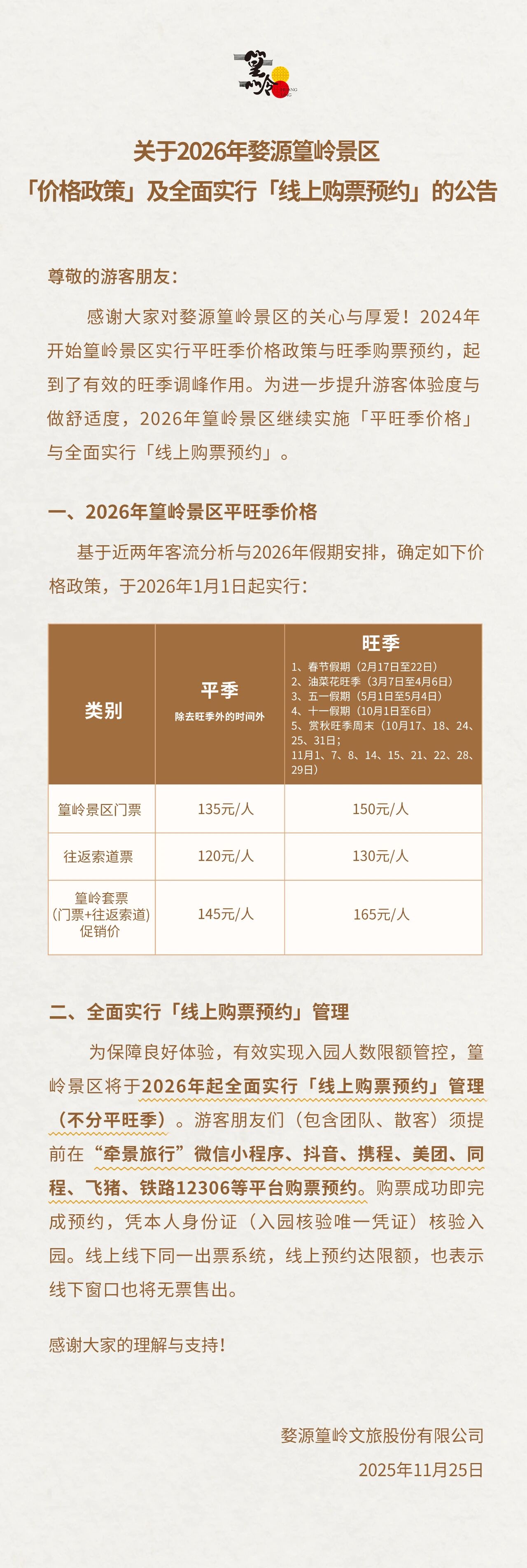 关于2026年婺源篁岭景区「价格政策」及全面实行「线上购票预约」的公告