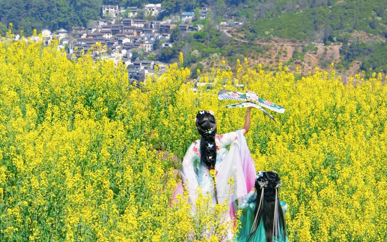 春天,千亩梯田油菜花海铺成金色画卷,古村内桃花、梨花、玉兰花齐放,造就了百花绕村的奇妙景象;
