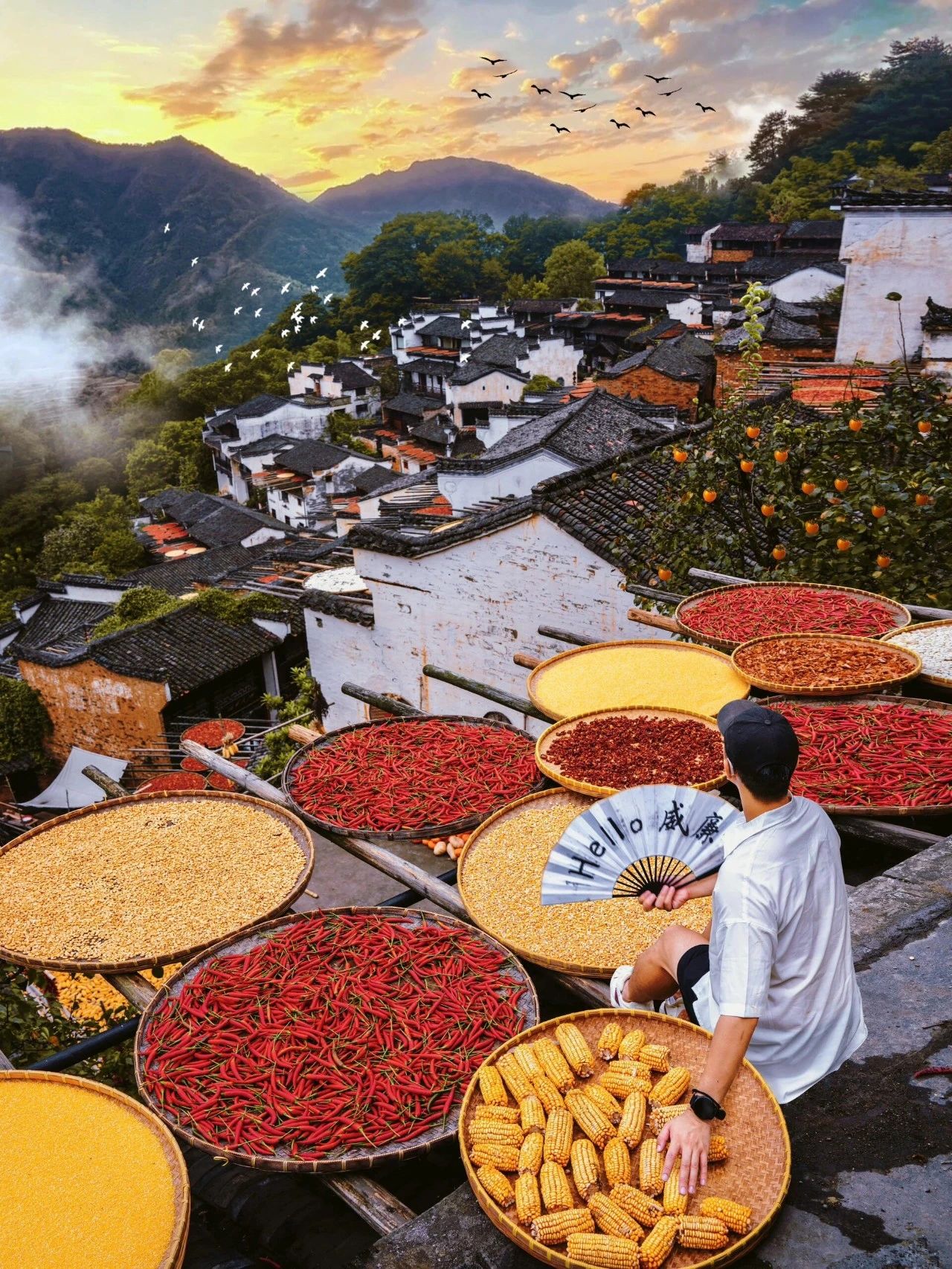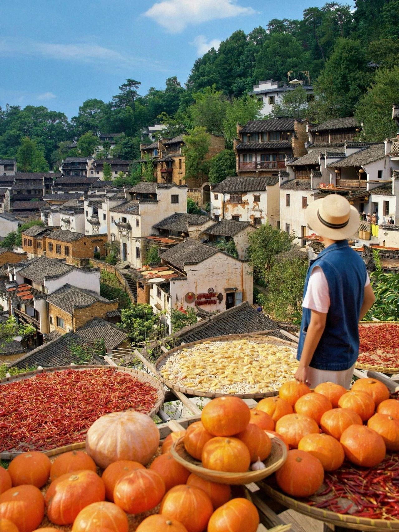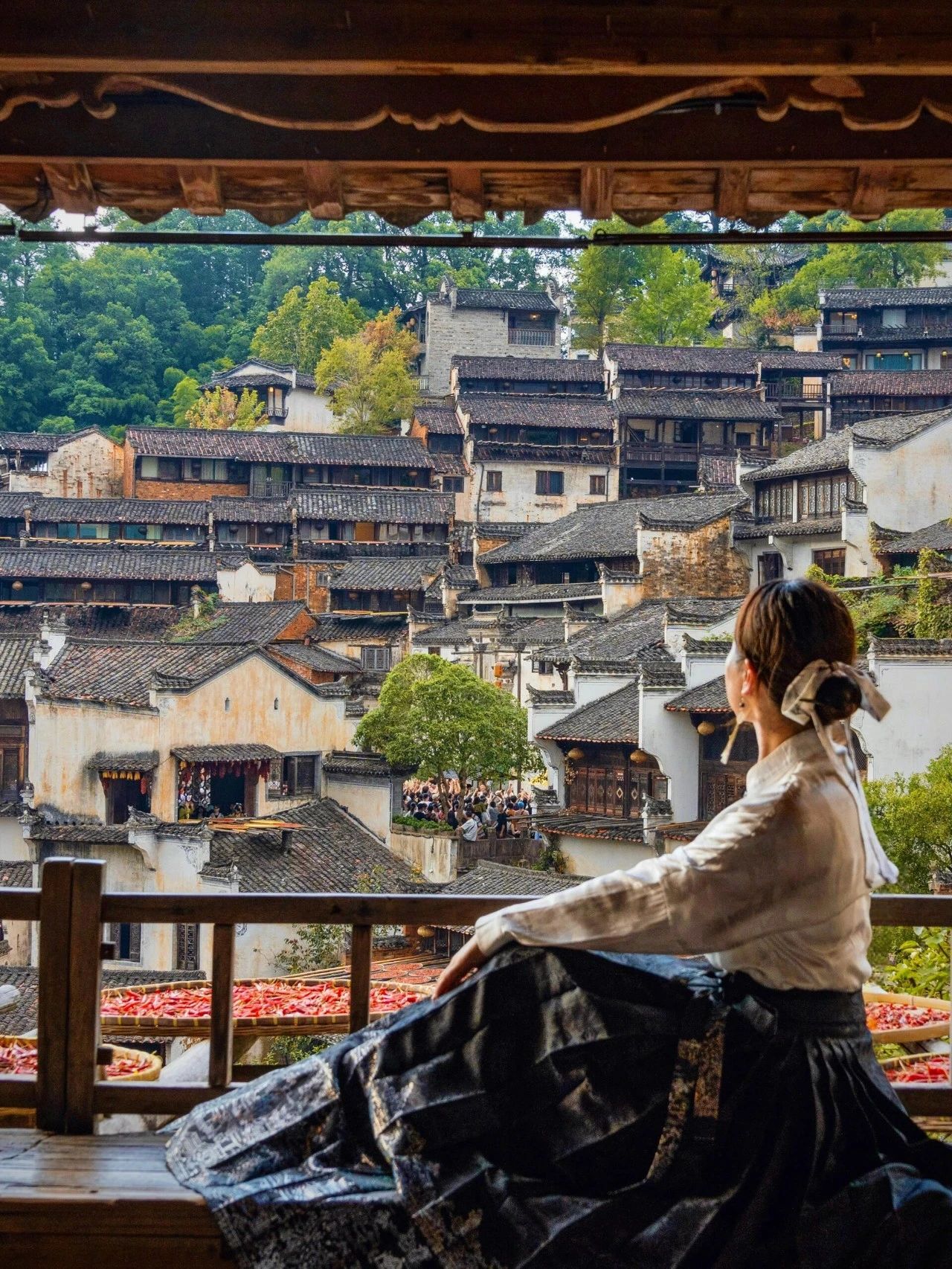 在众屋广场观景台,晒秋是绝佳前景,很适合拍近景人物,待到深秋,千年枫香红透,这里也会成为篁岭最热门的打卡点。