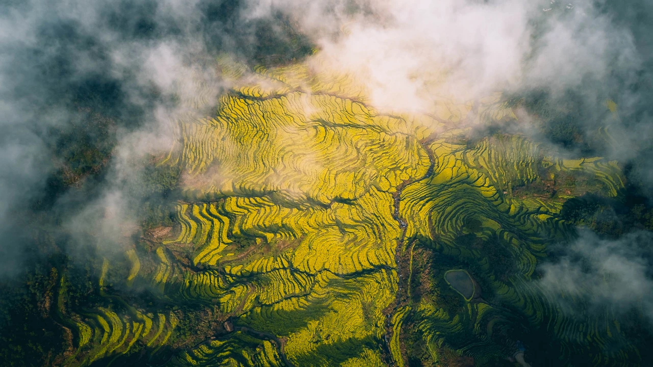 千亩梯田顺着山势铺开,金黄的油菜花在薄雾中若隐若现,像谁用淡墨在宣纸上点染的色块。远处的山峦只剩下模糊的轮廓,层层叠叠的花田与粉墙黛瓦的村落连成一片,宛如一幅未干的水墨画。