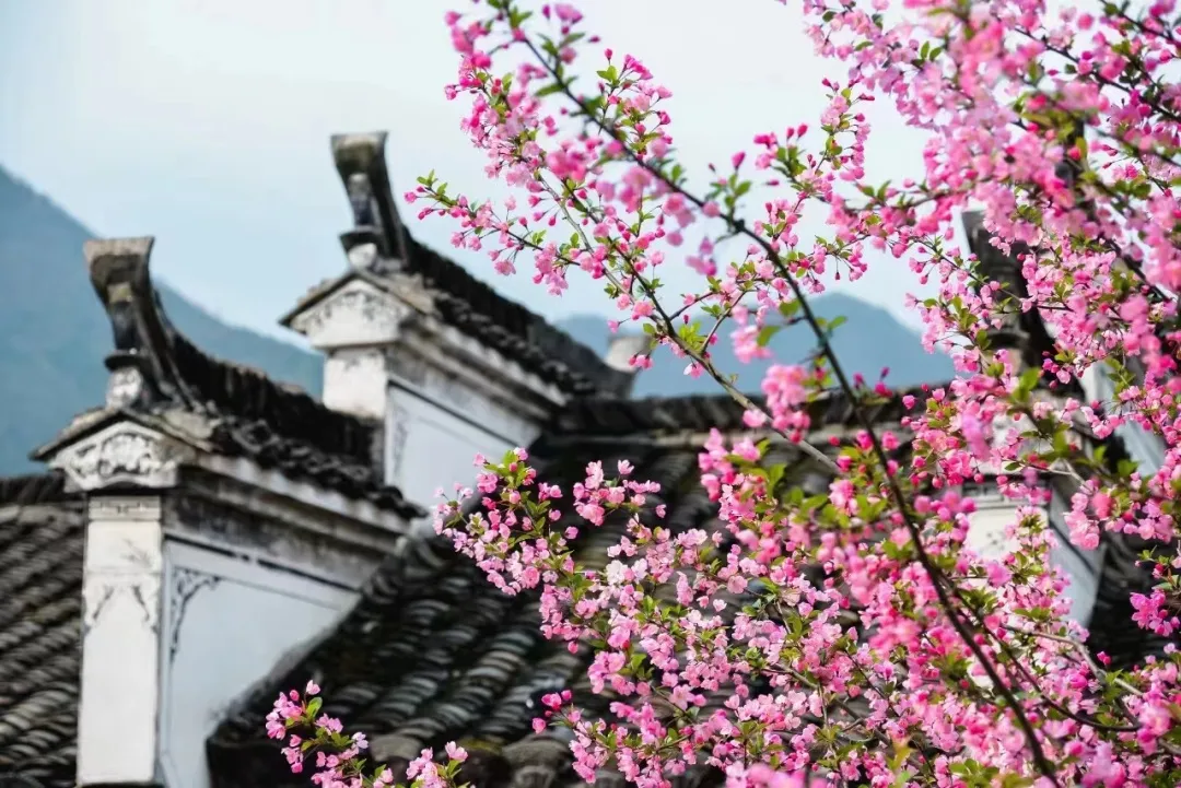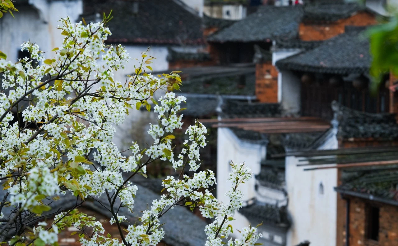 玉兰花经过雨水的滋润开得更加艳丽,梨树枝头冒出星星点点的白花,桃树嫩芽裹着淡粉,在檐角墙头探头探脑。石板路上泛着湿润的光,新绿从砖缝里钻出来,与村落的粉墙黛瓦相映成趣。