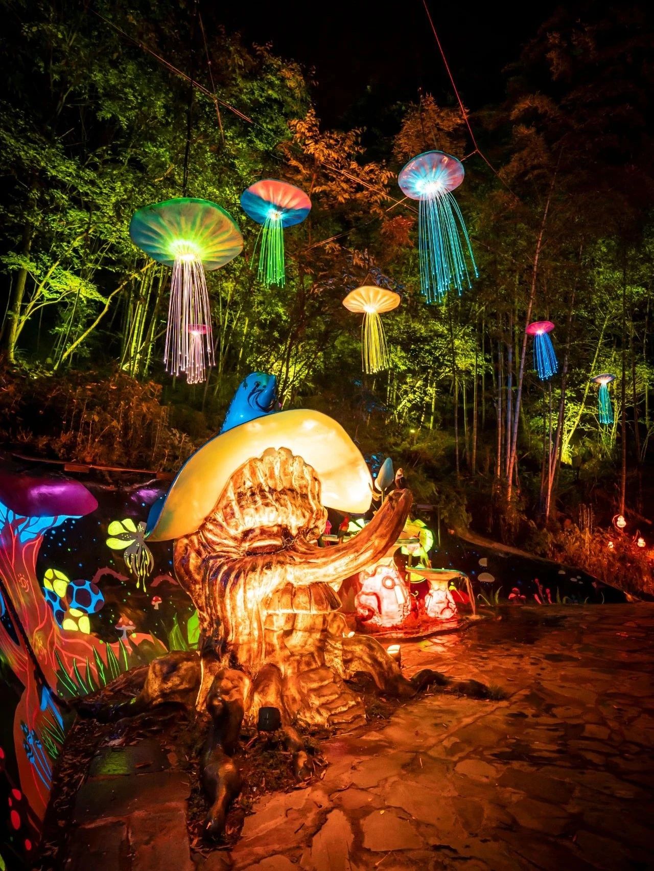 5月19 日起,篁岭乡村夜游季正式开启。流光森林、稻田奇遇区域夜游全面开放,五彩灯光把森林装点得如梦幻仙境,和古村夜景、花溪水街相互映衬,构成了浪漫的乡村奇妙夜。漫步其中,仿佛走进了奇幻童话世界。