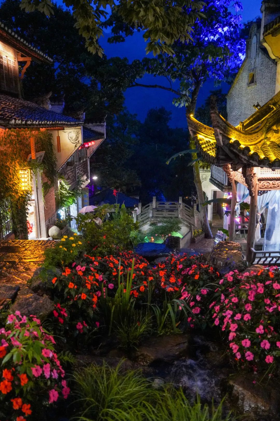 走在竹山书院前的小径上,抬头就是一片灯火璀璨的夜景:高耸的阁楼矗立在眼前,明亮的灯火从门窗里倾泻而出,树的影子在墙面上摇曳,恍惚间好似来到了《千与千寻》中的梦幻世界。