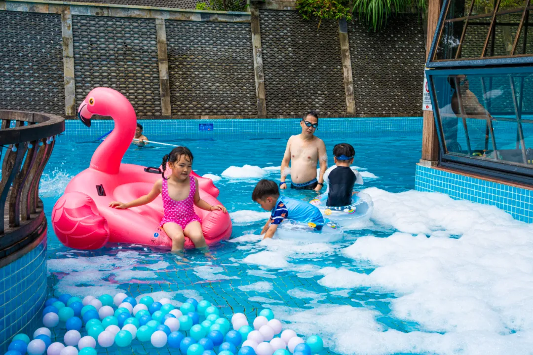 无边泳池是孩子们的尖叫乐园!纵身跃入彩虹泡泡池的梦幻海洋,在水枪大战区尽情玩耍,清凉水花四溅,笑声此起彼伏。家长可在池畔享用精致下午茶,惬意观战或加入狂欢!