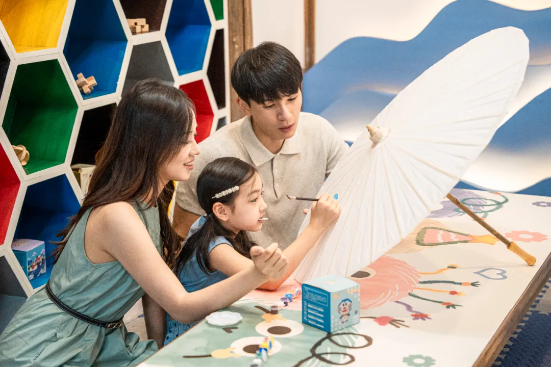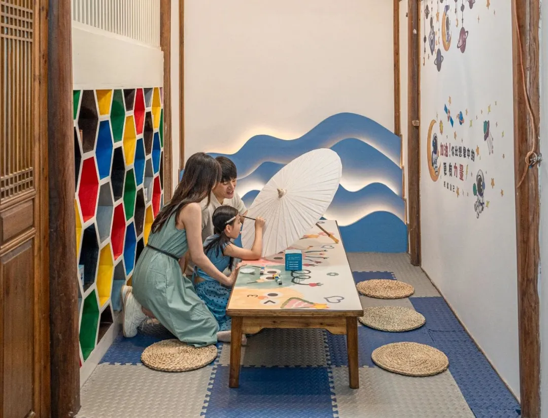 在酒店专属手作工坊,参与亲子非遗体验项目——传统油纸伞制作。在专业老师指导下,家长和孩子共同协作,完成绘图、裱糊等步骤,亲手制作一把独一无二的油纸伞。这不仅是一次趣味手工,更是对传统文化的触摸,成品可带回家珍藏,成为独特的旅行纪念。