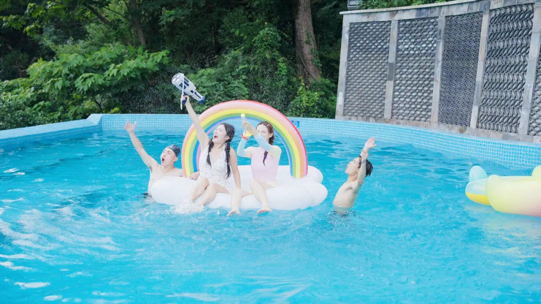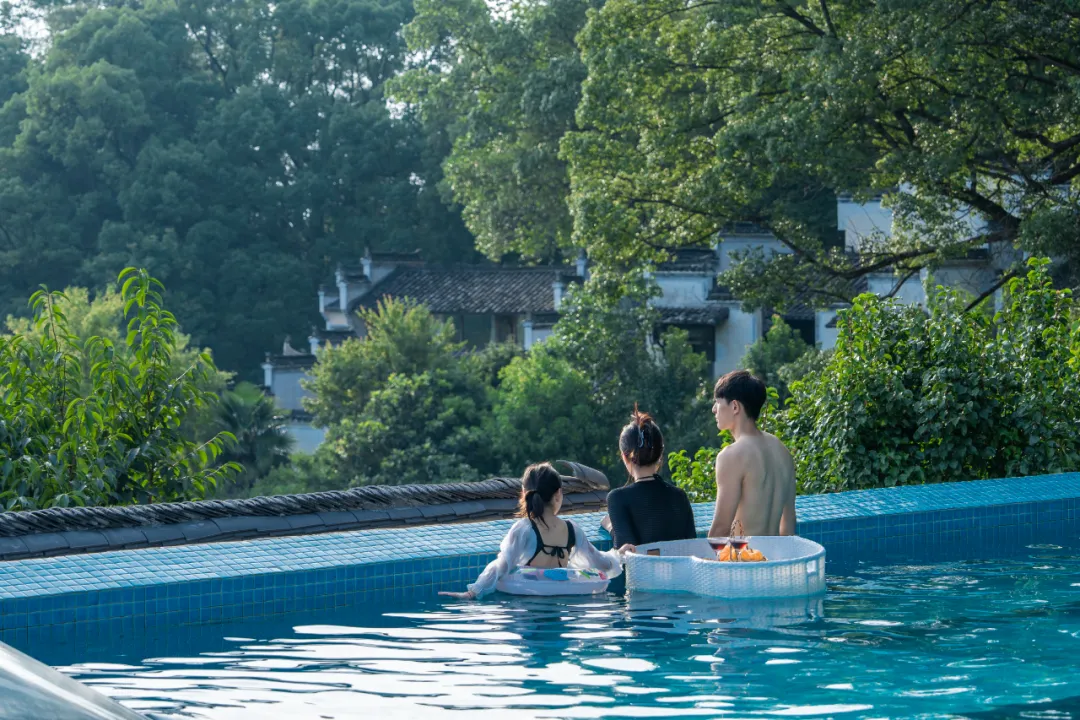 在篁岭,夏日的松弛感从一汪蓝色开始。无边泳池镶嵌在古村与群山之间,水面像一块被天空打磨的镜面,倒映着流动的云与远山的轮廓。