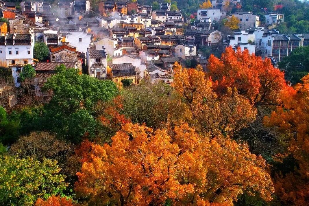 枫叶渐次染红,从浅绛到深朱,为古村披上绚烂的秋装。阳光透过斑斓的叶片,在地上投下斑驳的光影。漫步在青石板路上,脚下落叶沙沙作响,每一步都仿佛踩在秋天的旋律上。远望处,层林尽染,仿佛天边的云霞落入了人间。