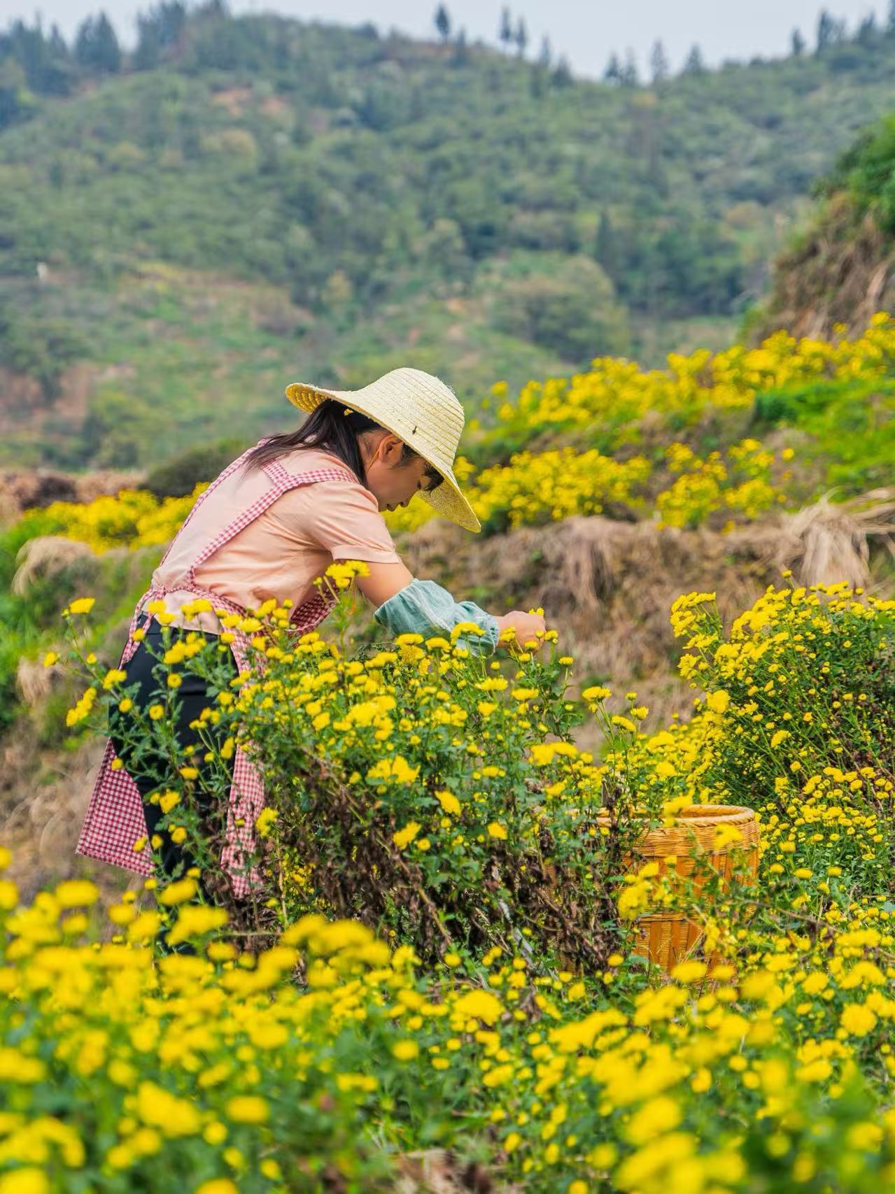 这时,家家户户开始晾晒皇菊,圆圆的竹匾里铺满金色的花瓣,在阳光下熠熠生辉。晾晒好的皇菊可以用来沏茶,金黄色的茶汤中仿佛盛满了整个秋天的阳光,轻轻啜饮一口,温暖便从舌尖一直蔓延到心底。