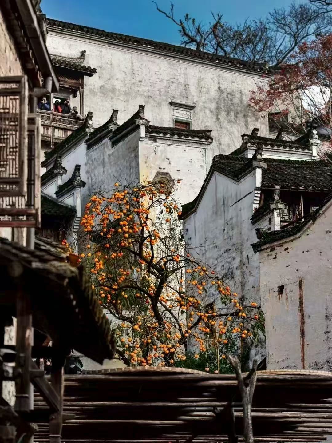枝头的柿子红得愈发浓烈,像一个个小灯笼。它们沉甸甸地挂满枝头,与古朴的徽派建筑相映成趣,为渐冷的天气增添了一份温暖的色彩。这红艳的果实,不仅滋养了身体,更温暖了人心,寓意着事事如意的美好祝愿。