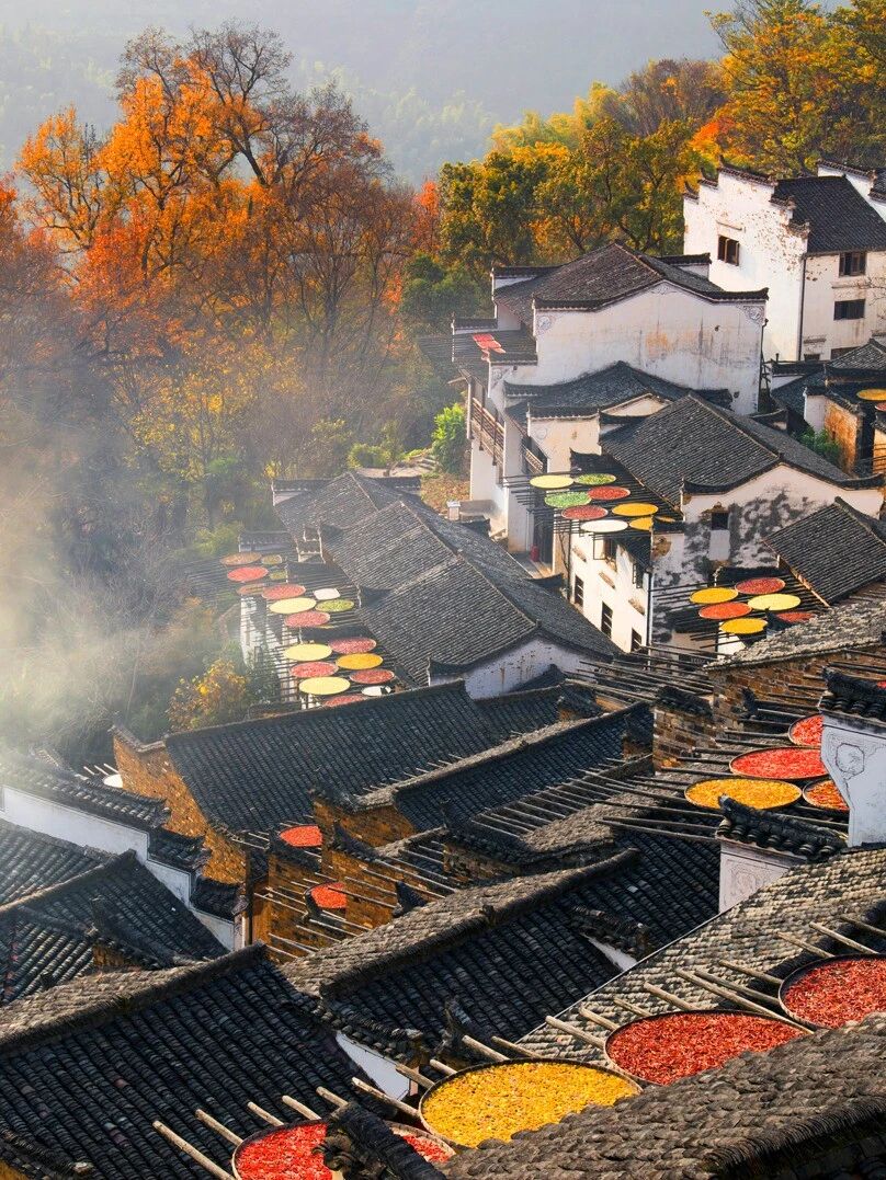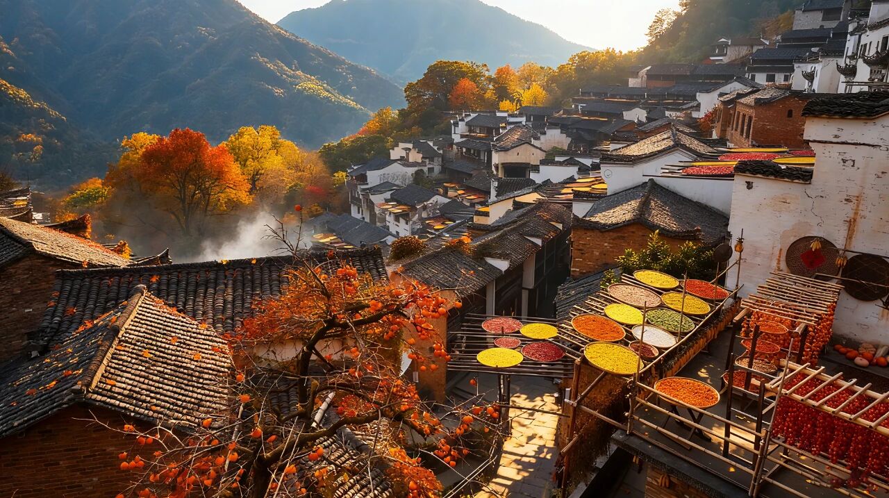 沿着天街漫步,枫树红叶似火,柿子高挂枝头,与家家户户晒架上的玉米、辣椒、稻谷相映成趣,红的热烈,黄的灿烂,橙的温暖,这幅独属于篁岭的晒秋风景画,是别处再难寻觅的秋日限定。