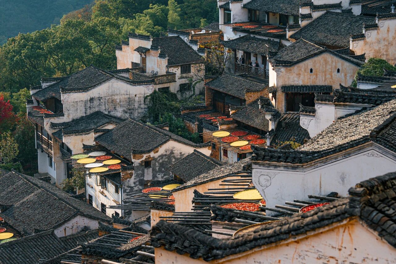 秋日篁岭裹着徽州古韵,红枫映白墙、金柿缀黛瓦,晒秋竹匾错落成景,人文底蕴与秋日风光相融,适配研学求知、会务欢聚等多元场景,让每段行程都藏着温暖质感。