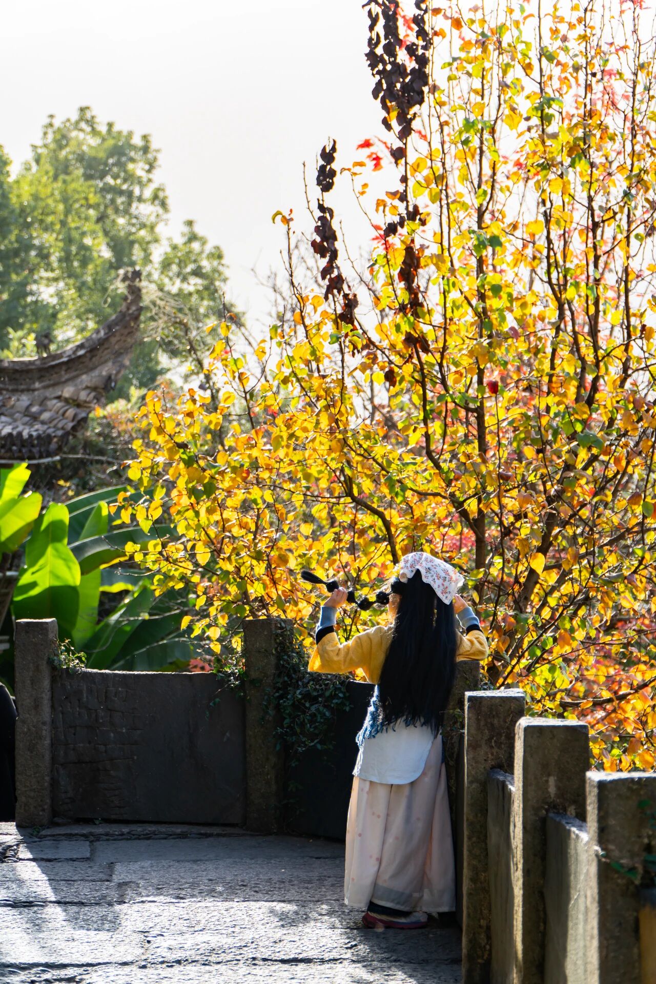 漫山红枫,红得热烈,再衬着白墙马头墙的素雅,烟火气与秋意相融合。偶有游人走过晒场,身影映在红叶与农产间,动静相衬,成了这幅乡愁画卷里最鲜活的一笔。