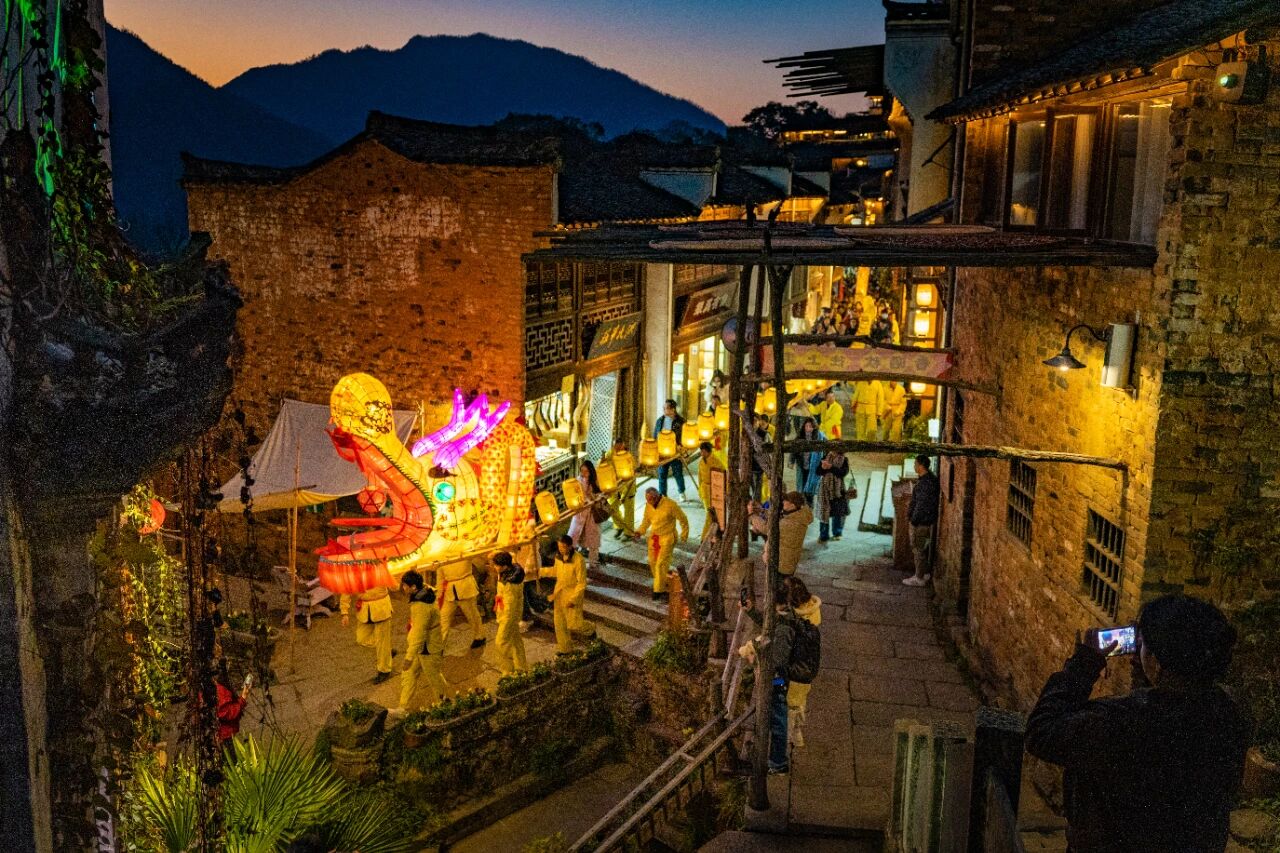 傍晚时分,灯光亮起,非遗灯彩与红枫相映,板凳龙灯在村间穿梭,耳边是锣鼓声与游客的惊叹声,仿佛一场流动的民俗盛宴,让红枫景观不再孤单。