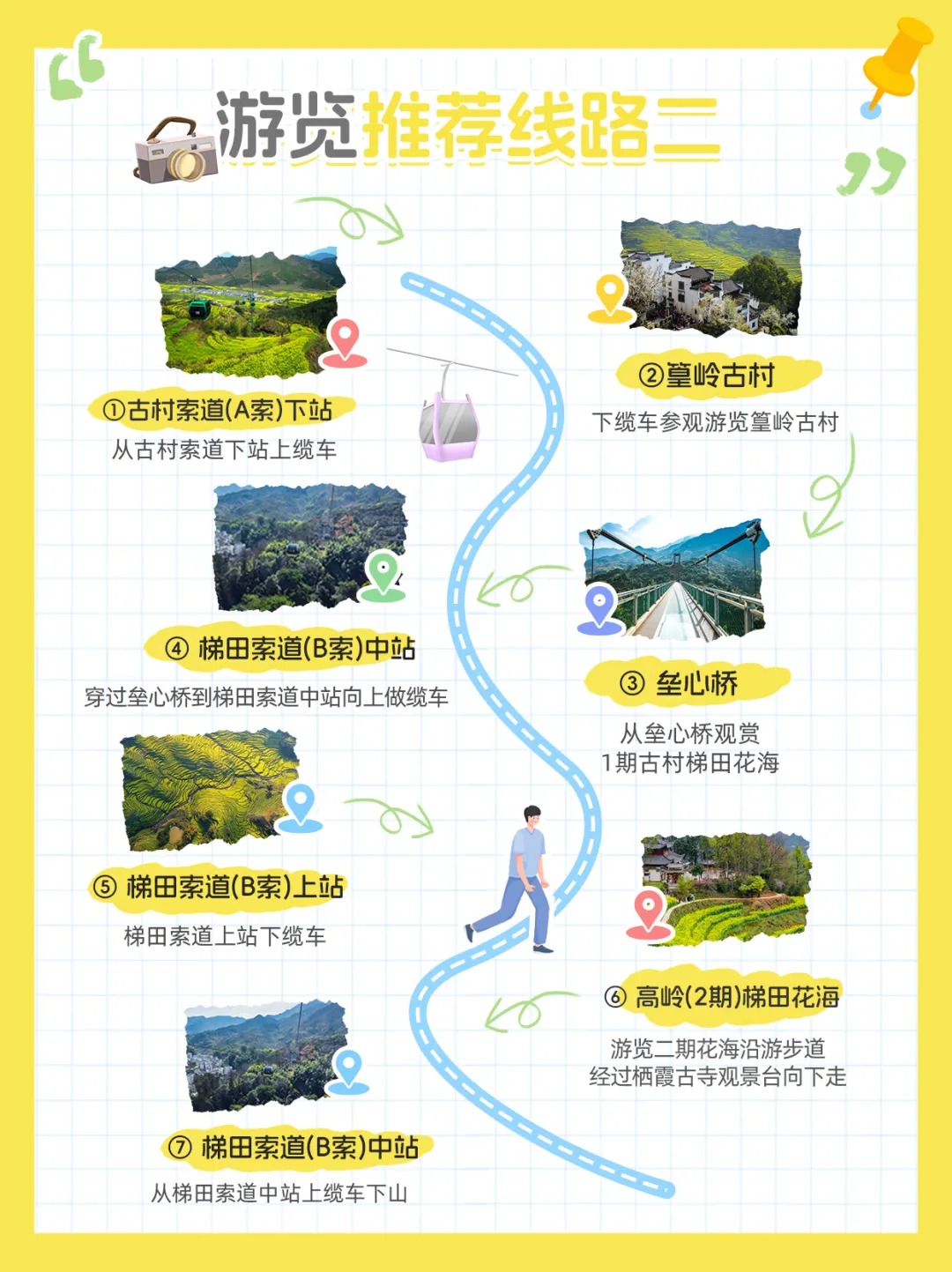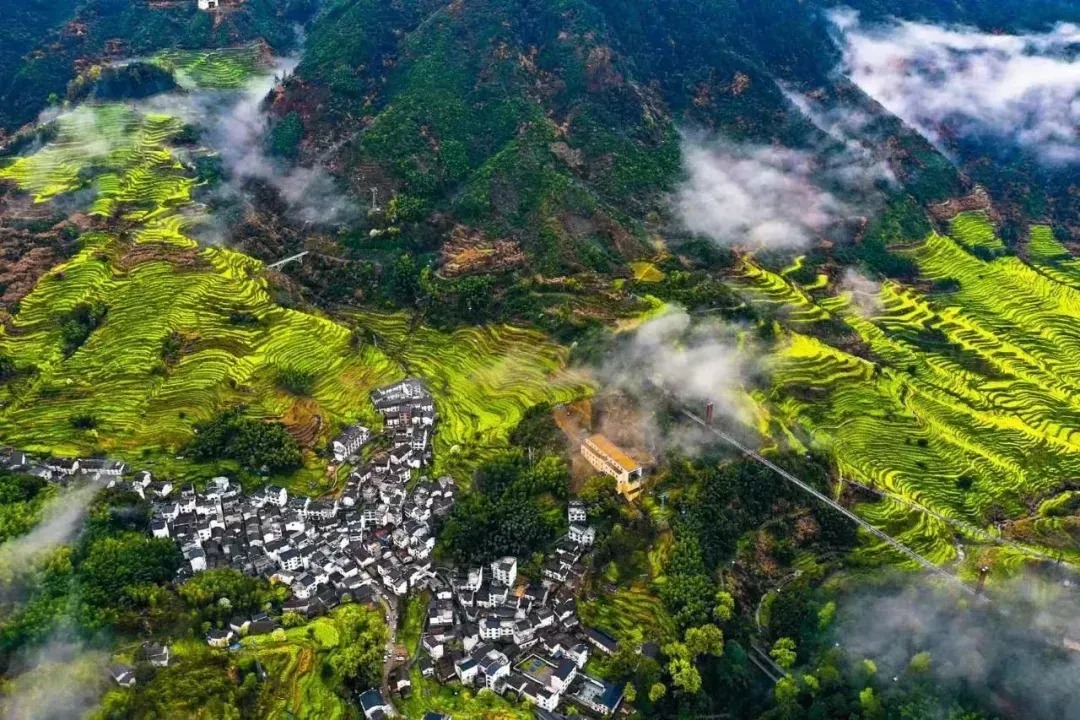下索道直达最佳观景位,此处可览整片高岭梯田油菜花,金黄花浪与远山云雾交融,还能远眺一期古村花海与徽派村落相融之景,随手一拍就能出片。