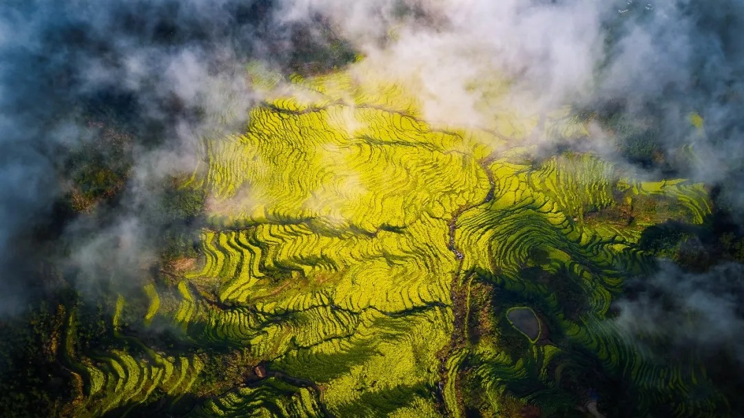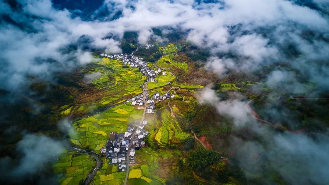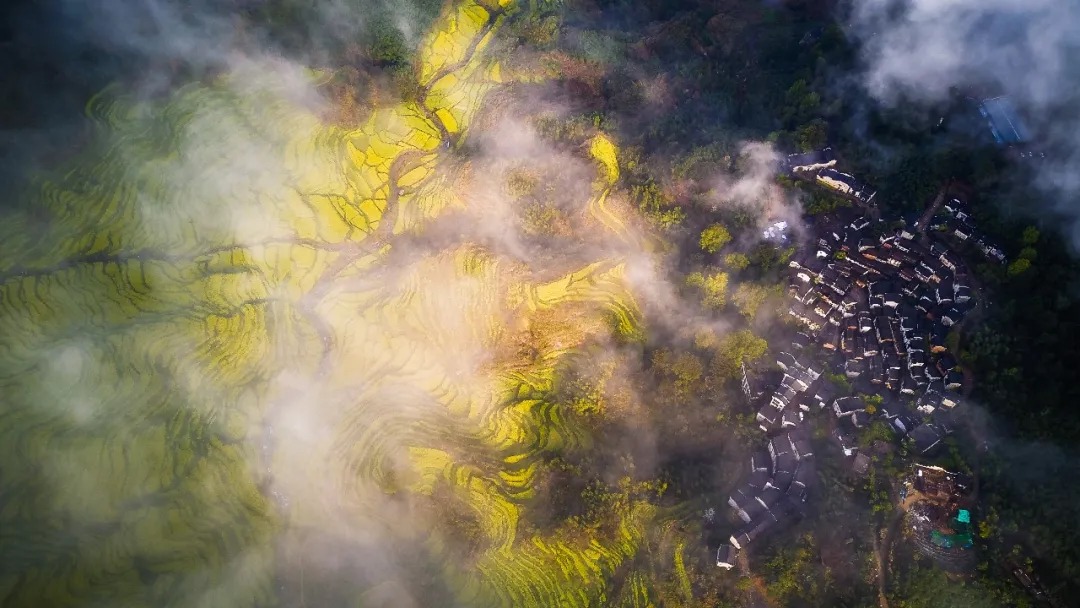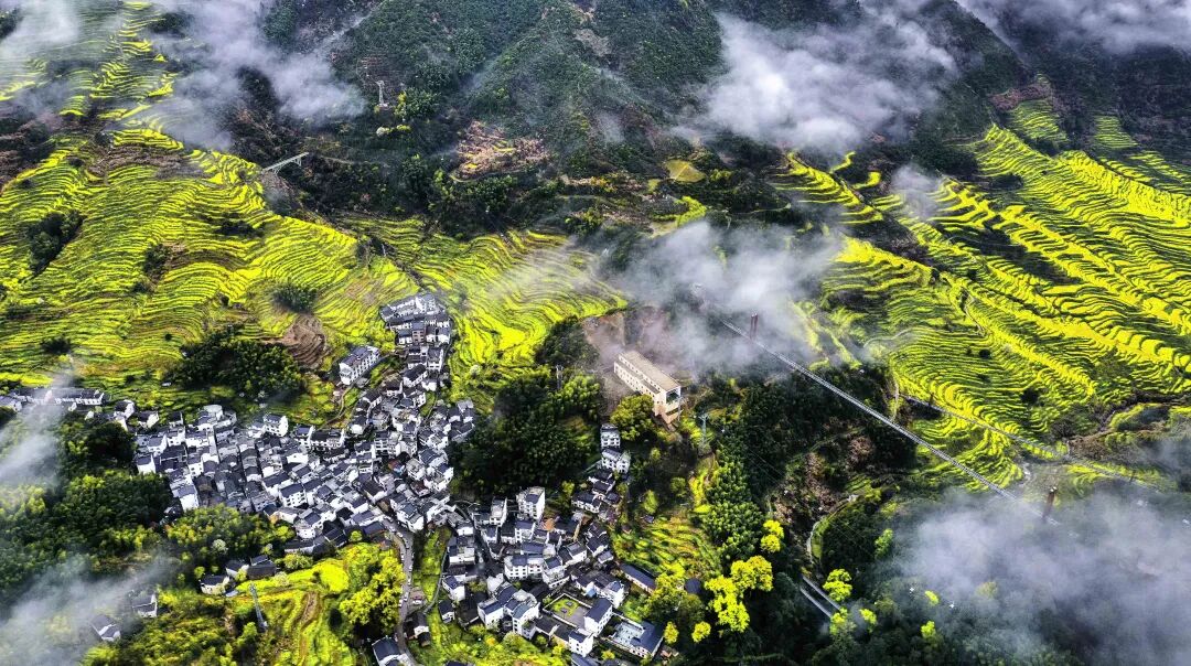 很多人总觉得,赏花要趁晴光正好,却不知春雨浸润的篁岭,藏着江南春日最绝的水墨意境。近来连绵的春雨,给这片山野蒙上了一层柔美的滤镜,山间漫起轻薄的云雾,万亩金色花海在烟雨中若隐若现,层层叠叠的梯田顺着山势起伏,粉墙黛瓦的徽派古村半藏在云雾间,像一幅刚落笔的水墨丹青,每一眼都透着仙气。