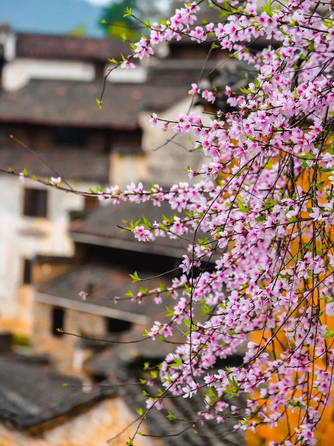 当然,篁岭的春天,从来不止有油菜花的金黄。三月的风里,藏着一场接一场的花事盛宴。桃花开得热烈,粉扑扑的花簇缀满枝头;梨花胜雪绽放,洁白的花瓣落满溪面,粉白相间的花影映着青砖黛瓦,把古村晕染成了一幅灵动的春日画卷。